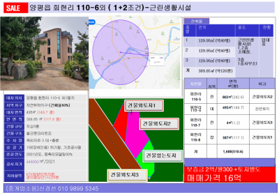 매물번호 10879 8천만원 인하! 매매가 2억7천만원 ✅ 매물 핵심 요약 매매가: 2억 7,000만 원 (기존 3억5천 → 8천만원 인하) 위치: 경기 양평군 양서면 목왕리 대지면적: 164평 (도로지분 포함 시 약 188평) 건축면적: 14평 주용도: 제2종 근린생활시설 방1/다락/욕실/주방겸거실/외부창고/주차 다수 가능 방향: 남동향 (거실 기준) 입주 가능: 즉시 협의 가능 사용승인일: 2022.09.08 🏠 매물 설명 양수역 차량 10분 거리 내 위치한 감성적인 근생 매물입니다 3억5천 → 2억7천으로 대폭 인하된 급매물! 세컨하우스로 안성맞춤인 공간이에요. 진입도로도 편리하고, 주차도 편합니다 가전을 모두 두고 가시기로 해서 따로 내부를 채우실 필요가 없습니다 🌳 외부 공간 주변 메쉬펜스 및 철제대문 설치 잔디마당, 파쇄석 시공 전면 목재데크 및 어닝(awning) 설비로 실용성과 감성 겸비 🛋 내부 구조 방 2개 / 거실 겸 주방 / 욕실 1개 거실 벽걸이 에어컨, 주방 인덕션 3구, 욕실 온수기 등 기본 생활 설비 완비 🌿 이런 분께 추천드립니다 ✅ 실내외가 아기자기하게 꾸며진 감성 전원주택을 찾는 분 ✅ 마당이 넓은 세컨하우스나 주말주택 찾는 분 ✅ 즉시 입주 가능한 곳을 찾는 분 📍 코드랩 공인중개사사무소 경기도 양평군 양평읍 잿말길 28, 1층 대표: 성호건 ☎ 031-775-8025 등록번호: 제41830-2024-00039호 #양평목왕리전원주택 #양서면전원주택 #양평급매물 #양평조립식주택 #양평세컨하우스 #양평목조주택 #양평양수리전원주택 #양평생활형주택 #양평공인중개사 #코드랩공인중개사사무소 #양평매물추천 #양평자연속전원주택 #양평라이프